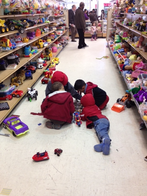 | How you can often find my kids at the thrift store–sprawled on the floor playing in the toy aisles! |